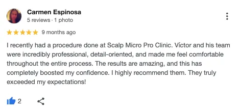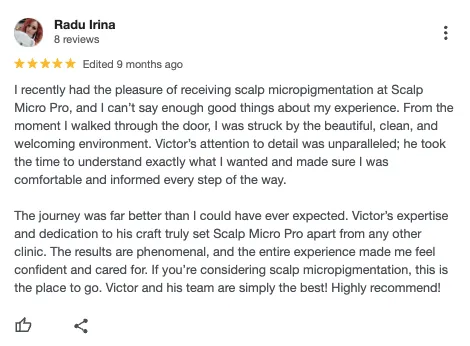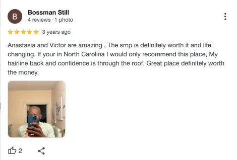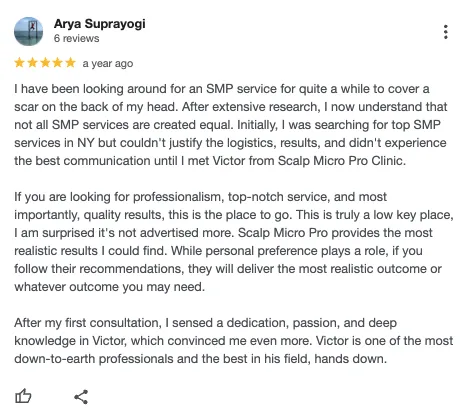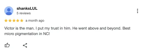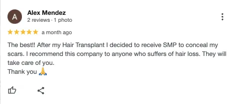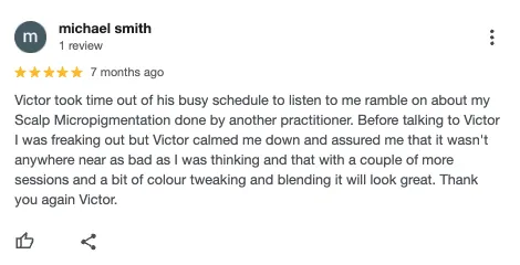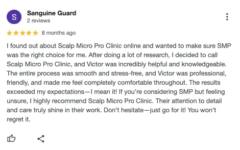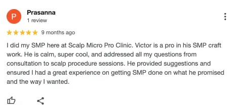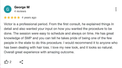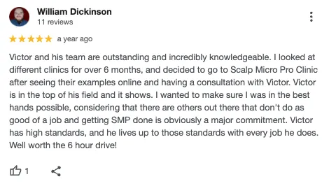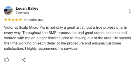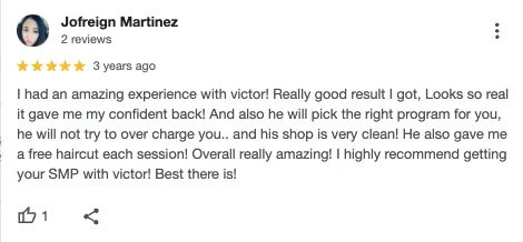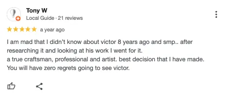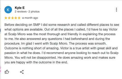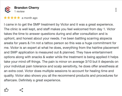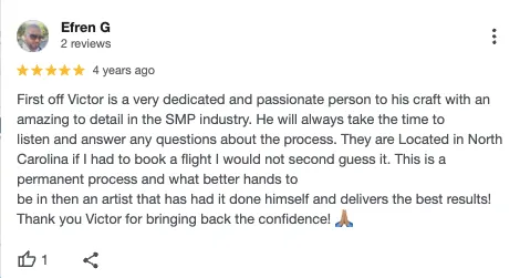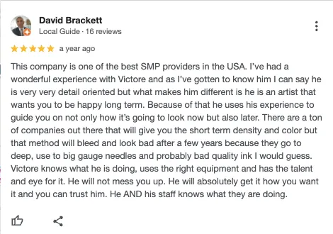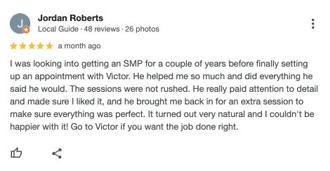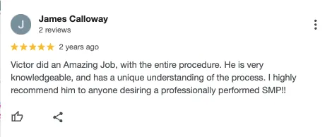 "I found out about SMP online, knew that I instantly wanted it done. I did a lot of research on finding a good artist. I came across Victor and the rest was history. He made the whole process seamless and made me feel very comfortable.. I couldn’t be happier with the results. I almost chickened out but I’m so glad I didn’t. If you’re on the fence about it, DO IT. I highly recommend you go to Victor because he’s been doing it for 8 years and his craftsmanship shows. "